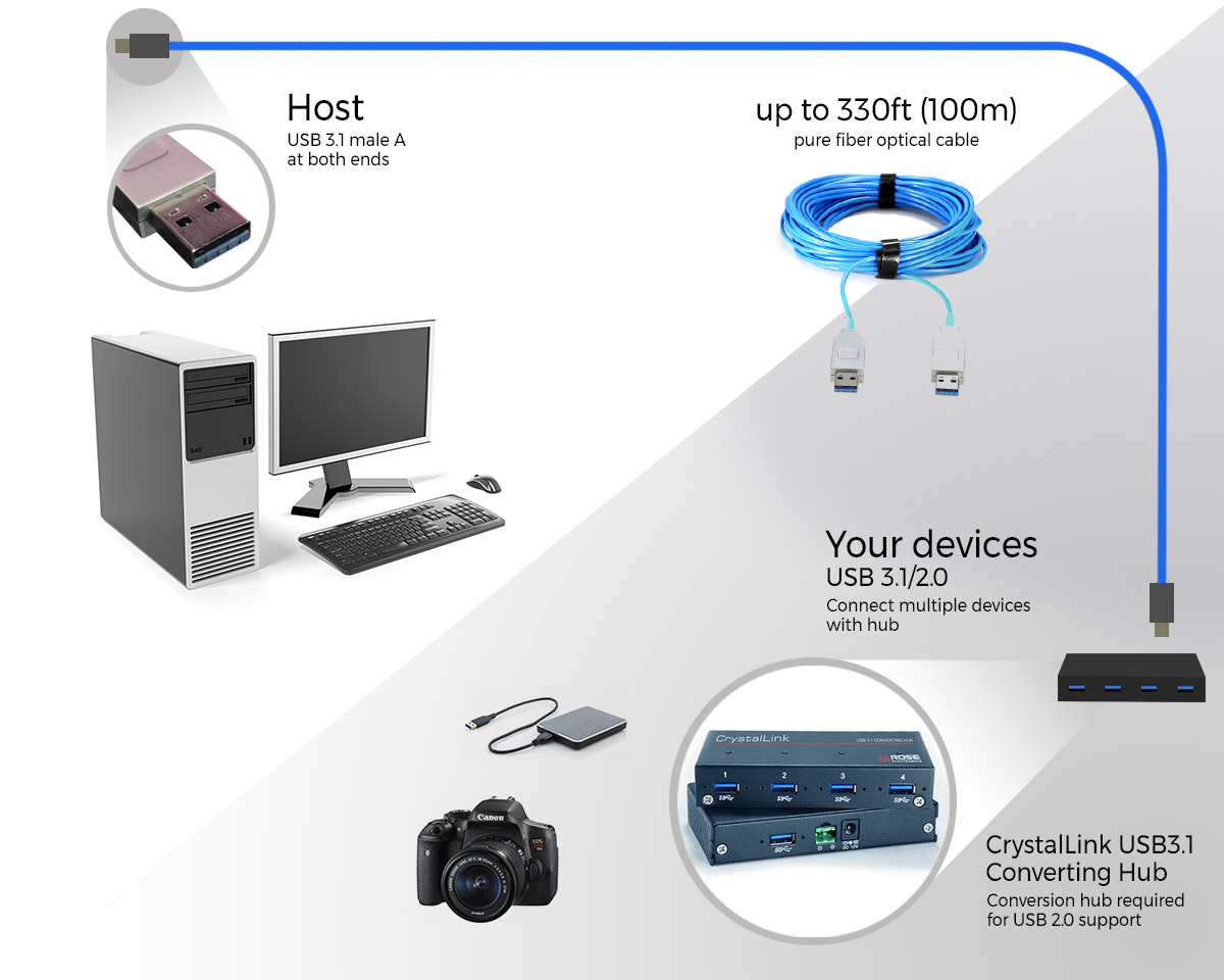 - Cable with built in optics to extend USB3.1 gen 1 up to 300 feet (100m)