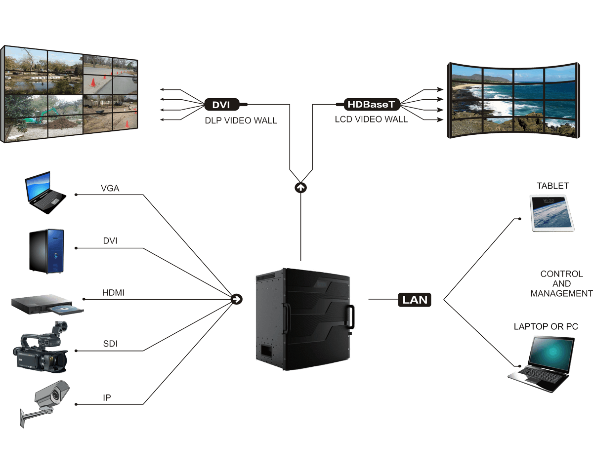 - Input video input formats include VGA, YpbPr, CVBS, DVI Single and Dual Link, HDMI, SDI, and DisplayPort