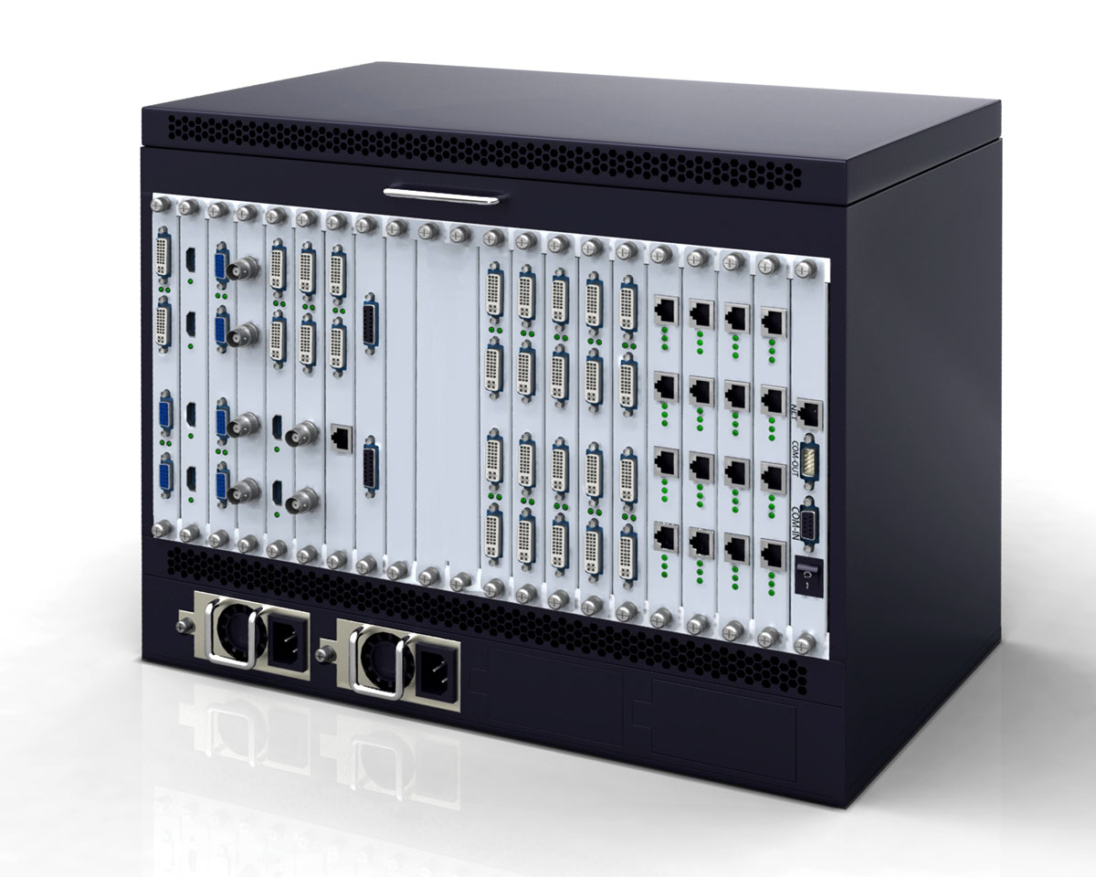 | Connectors | Video in: DVI-D single linkDVI-D Dual link (4K)HD15 (VGA)HDMIBNC (SDI)DisplayPort (4K)RJ45 (HDBaseT)LC Fiber (Single mode)Video out:DVI-I (DVI and VGA)DVI-D Dual link (4K)HDMI, HDMI (4K)BNC (SDI)RJ45 (HDBase T)LC Fiber (Single mode)Power: Barrel jackConfig: RS232 DB9, RJ45 Ethernet |